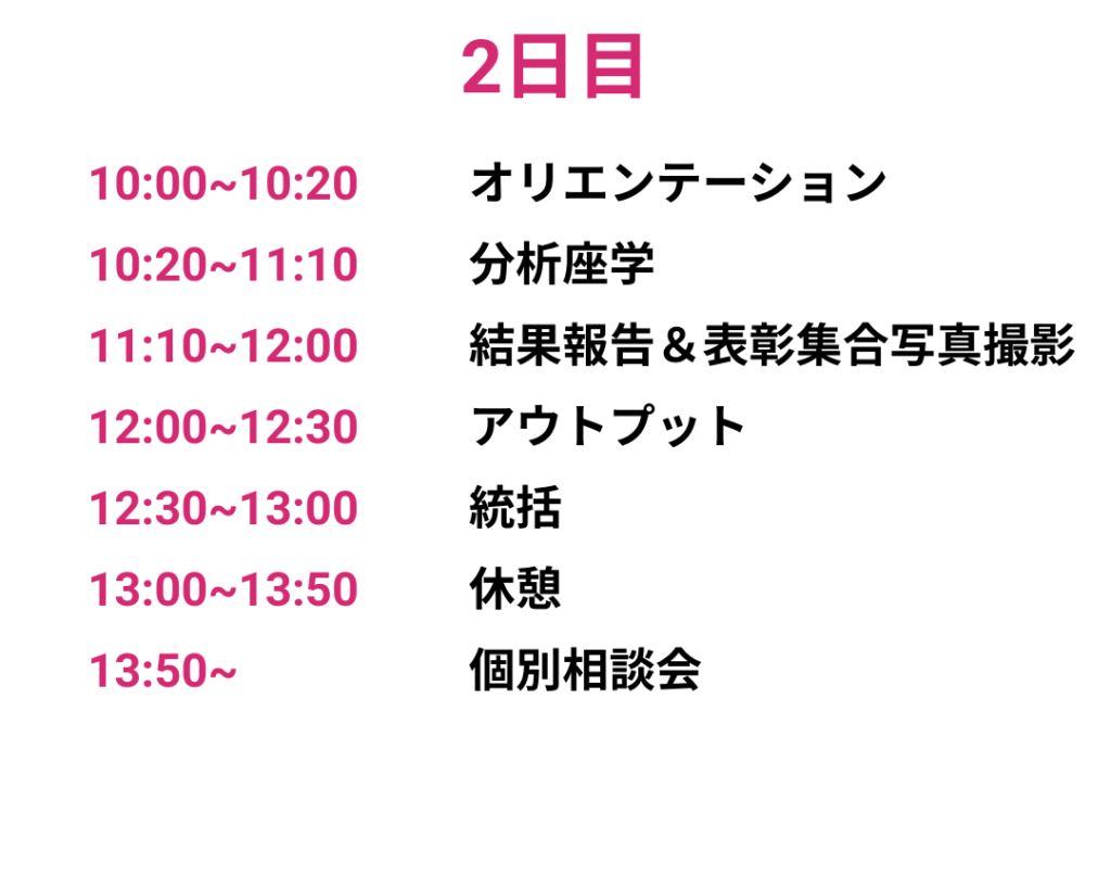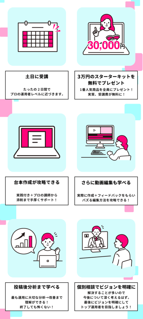 A2. 2日間で「勝ちパターンの設計」「投稿までの実行」「分析の型」をインストールします。その後は、型に沿って実践を重ねることで成果につながります。